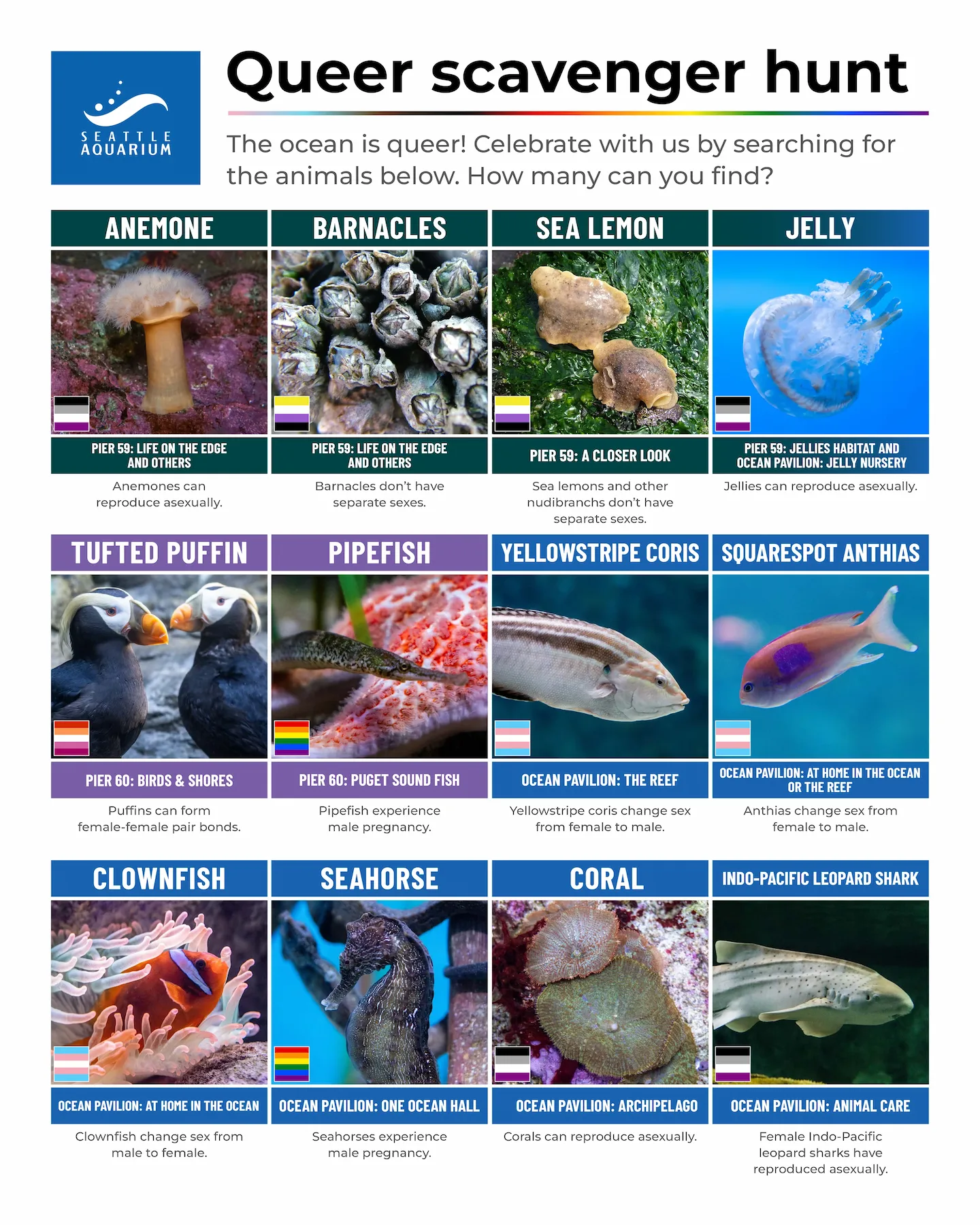 To claim your prize, look for a Seattle Aquarium staff member wearing a blue shirt.