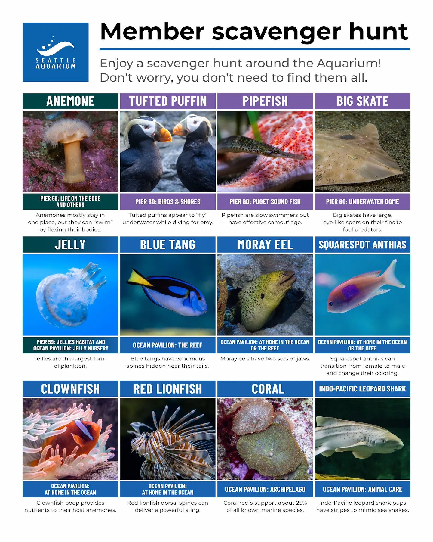 Enjoy a scavenger hunt around the Aquarium! To play, download or take a screenshot of the game board below. Use your phone to cross off animals as you find them. Don’t worry, you don’t need to find them all.